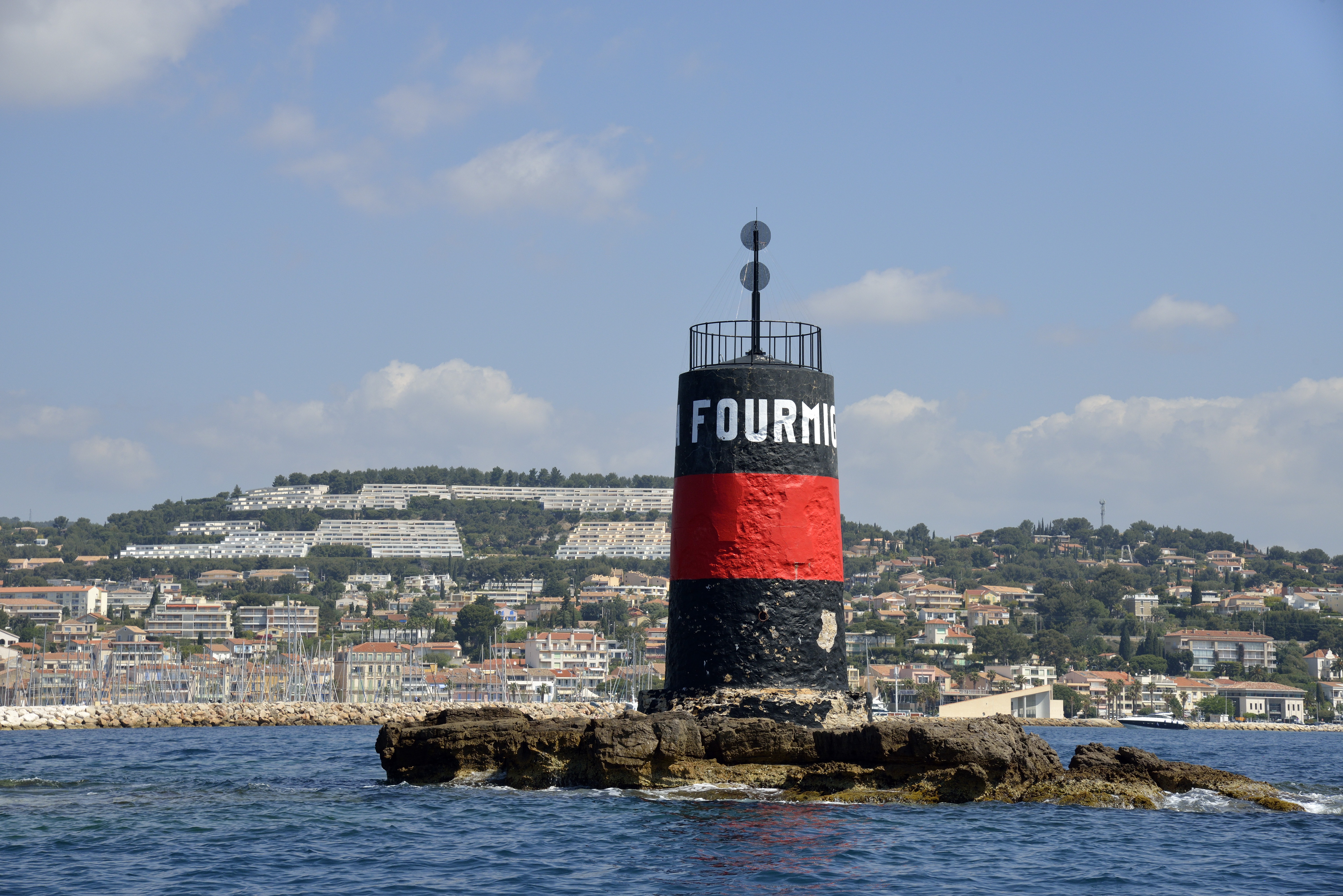 Commentaires : Vue sur la balise de la Fourmigue (patrimoine maritime géré par les Phares et Balises) sur fond d’urbanisation (front de mer et collines de Bandol), avec au sommet une opération immobilière remarquable de Jean Dubuisson (classée Patrimoine du XXème siècle en PACA). Le littoral et le collinaire sont très urbanisés, la végétation n’est plus aussi prégnante. La balise est sur une route nautique très fréquentée en toute saison entre le port et l’île de Bendor. La traversée est très agréable avec des petits fonds aux roches rouges dans la petite passe (bateaux, paddles), les paysages très intéressants.